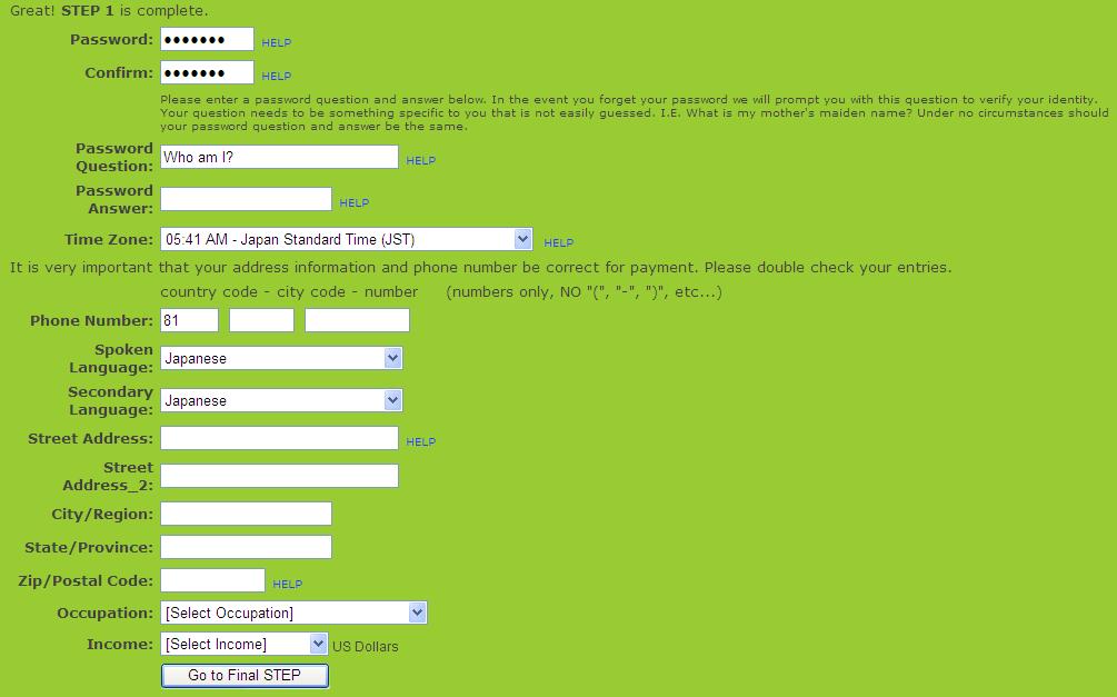 | Secondary Language | 話してる言葉、Japanese を選択(英語などを話せる人は、自由に選んでください。) |